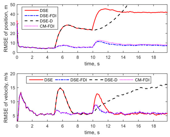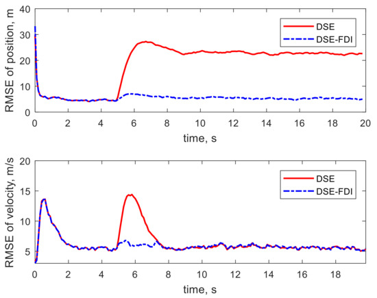 After verifying the effectiveness of the proposed injected data detection and attack parameter estimation method, we compared DSE-FDI with the DSE method. Figure 5 plots the RMSE of the estimated position and velocity over time for DSE-FDI and the DSE method. It can be seen that DSE-FDI performed the same as the DSE method when no attack existed, but it performed much better than the DSE method when suffering from an FDI attack.
