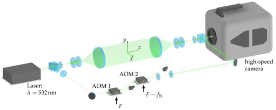 Measurement principle of the heterodyne Mach–Zehnder interferometer. Laser: nm, solid state laser; camera: 64 × 1024 Pixel, : 30 kHz, field of view: 2 × 30 mm, frame rate: 120 kHz. Taken from [7].