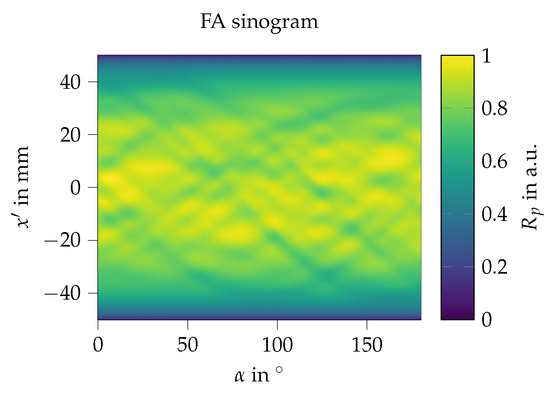 The tomographic reconstruction is performed as follows: Let the measurement of a projection be a vector to in a transformed plane from an angular perspective of the rotation angle as shown in Figure 2. Using a total number of scan lines and angular scans these vectors give the sinogram with dimensions (see Figure 3).