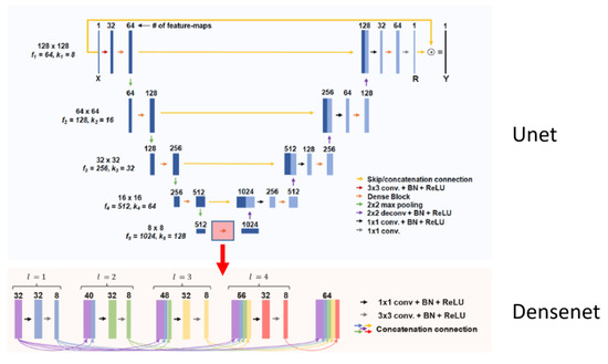 Equation (8) represents a neuron k, which exhibits a nonlinear activation function f. This again produces a nonlinear transformation of the input signal. Weights are parameters updated by error propagation, also known as backpropagation. Neurons are usually grouped into layers, which can be distinguished into input, hidden and output layers. The connection model between layers can vary. So, comprehensible task processing can be achieved. The most common layer topologies are perceptron layers as well as convolutional layers. This last type is particularly efficient for tasks regarding image processing [19,33,34]. The type of neural network is determined by its architecture. This refers to the size, type and connection model that exists between the layers. The implementation of convolutional layers in neural networks has become a crucial factor for image processing tasks in recent years [19,35]. An example of this, is the Unet in Figure 4, top. Later, the Dense Unet has shown improvement (Figure 4, overall) by replacing convolutional layers with denseblocks [19]. Here, a denseblock consists of a set of convolutional layers concatenated using a skip-layer strategy (see Figure 4, bottom). Similar to a convolutional layer, dense blocks have their own hyperparameters, such as the growth rate k and the number of repetitions l. The growth rate k refers to the feature layers that are calculated from the previous step. Then, l indicates how many times k feature layers will be concatenated.
