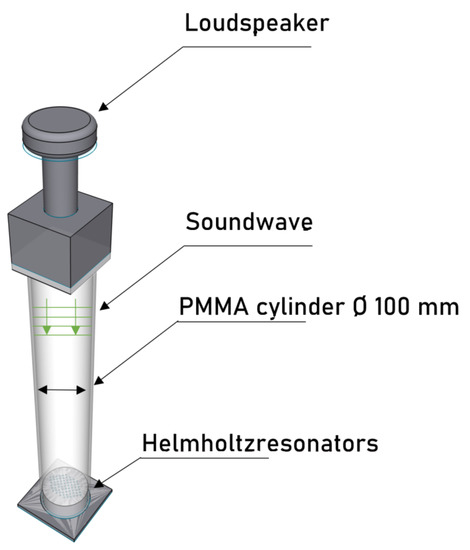 The aim was to enable a complete reconstruction of the local sound pressure under a limited incomplete angle. For this purpose, a full angle projection measurement of the sound field was performed with the CLIV system proposed in [9] as a reference. The sound field to be investigated was limited by a translucent PMMA cylinder of 100 mm diameter to allow a angular scan range of and shield the reference beam of the interferometer from the propagating sound wave in the measurement object. An approximately plane sound wave was generated by a speaker mounted to the top end of the tube. Thus, the sound wave propagates perpendicular to a hexagonal array of 169 Helmholtz resonators at the bottom of the cylinder (see Figure 5). Each Helmholtz resonator is cylindrical, has a resonator volume of 1.41 cm and a hole aperture of 2 mm diameter (see Figure 6). This results in a resonator frequency of 1479 Hz. The measurement of the local sound field was performed at the resonator frequency. The maximum effective lateral range of the CLIV system is 25 mm with a spatial resolution of 31.5 μm. In order to perform a measurement of the entire cylinder, the measurement was divided into seven, 2 cm wide lateral areas, which were stitched in post-processing.
