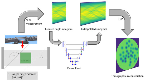 The hypothesis in this publication is that neural networks can be used to extrapolate data from missing scan angles to significantly improve reconstruction results. This enables the use of standard algorithms for the tomographic reconstruction. There are several existing deep learning based approaches employing neural networks to directly reconstruct local data. They replace the established standard reconstruction methods, such as filtered back projection, and achieve good results, for instance with sparse angle tomography [19,20,21,22,23]. Synthetic data are used for training and validation. Finally, reconstruction improvements of real limited angle sound pressure measurements are presented.