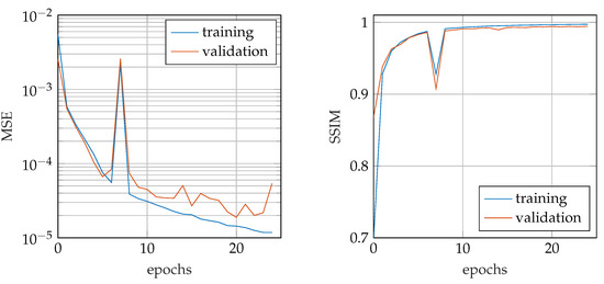 Visualization of training process with 60,000 data sets (48,000 training data set; 24,000 validation data set) over 24 epochs. As validation parameters mean squared error (MSE) and structural similarity (SSIM) are shown.