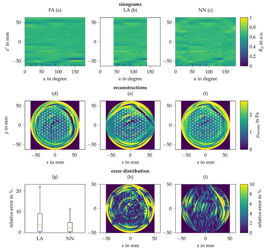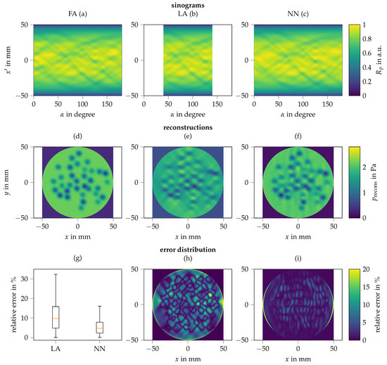 A synthetic sound pressure field was generated according to the parameters presented in Table 1 (2. line). The first row of Figure 9 shows the sinograms with full scanning angle (a), limited scanning angle (LA) (b) and the neuronal network based extrapolation (c). The second row shows corresponding local data computed by filtered back projection (d–f). The bottom row describes the relative error referred to the full angle filtered back projection tomographic reconstruction. The local error for limited angle and neural network reconstruction are depicted in (h,i). Boxplots at (g) show the corresponding error distribution.