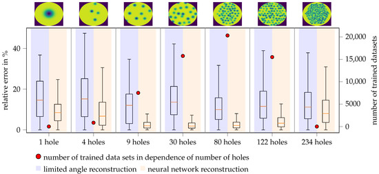 In a further step, the impact of complexity in the synthetically processed pressure fields was investigated. Therefore, seven different pressure fields with different number of resonators were generated. After the neural network extrapolation and tomographic reconstruction, the relative error distribution to the full angle reconstruction is shown in Figure 10. For a better understanding, the used model field is shown above every error distribution plot. To give a better overview, the number of trained data sets with the same number of holes, meaning the same complexity distribution is shown as well.