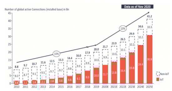 - Total Number of Device Connections by 2025. Available online: https://iotanalytics.com/state-of-the-iot-2020-12-billion-iot-connectionssurpassing-non-iot-for-the-first-time/ (accessed on 17 October 2020).