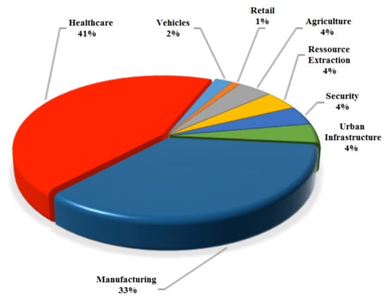 With respect to healthcare, the IoT primarily manages and comprises a network of interconnected medical devices over the Internet to create smart healthcare environments [26]. Networked medical devices in smart health “can be worn (wearables) or implanted inside the body, for example, pacemakers,” thereby providing services using smart methods. For example, “wearable health devices use an assortment of sensors to measure everything from heart rate, activity to sleep patterns and come equipped with communication capabilities. Such devices can form an IoT network for patient telemonitoring in hospitals and can also be used for home telemonitoring” [27]. Healthcare applications are projected to have the highest economic impact [28]. IoT-based healthcare and manufacturing applications are technologies that are expected to significantly affect society, as illustrated in Figure 2 [28].