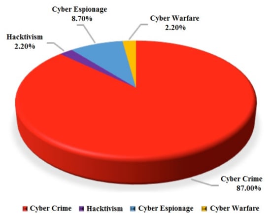 A previous study [72] showed that 70% of IoT devices can be attacked easily. In addition, an increase in the number of attacks by 10% compared with 2017 (77.39%) has been observed, which evidences that cyberattacks are growing in number, intensity, severity, and sophistication. Figure 5 [73] presents dominant cyberattacks as of July 2020.