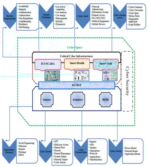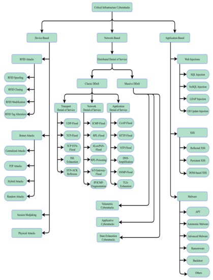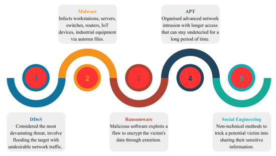 Therefore, critical cyber infrastructures are exposed to several cyber threats, including those inherited from the Internet and IoT as shown in Figure 4. In addition, such infrastructures can function as a springboard for the generation of new cyber threats and cyberattack vectors.