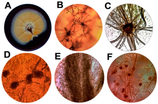 The microbiological features of this strain were the presence of globular/ellipsoid ascomata associated with the surface of the colony (Figure 1B). These structures showed an evident amount of lateral hyaline hyphae (Figure 1B,C). The terminal hyphae had a clear coiled shape (Figure 1D). These contained immature ascomata with no lateral hyphae (Figure 1D). The presence of vegetative mycelium was also observed (Figure 1E). The hyphae generated from the soma were tabicated and hyaline (Figure 1F).