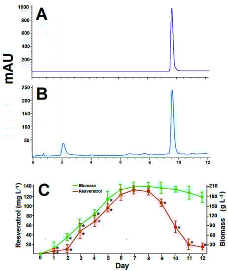 3.6. Resveratrol Production in Optimized Batch Cultures