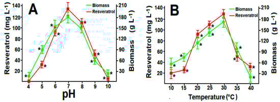 Effect of pH (A) and temperature (B) on the growth of A. aureus MaC7A and its RV production. * Indicates statically significant differences (p < 0.05) for RV production and biomass compared with that of pH 7 and 30 °C. Error bars indicate SD (n = 10).