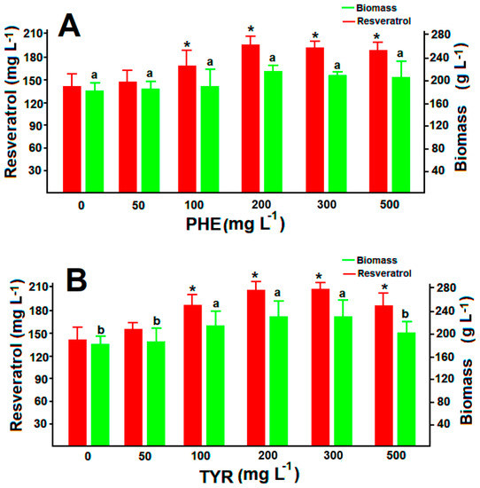Production of RV and biomass by the addition of different concentrations of PHE (A) and TYR (B) to batch cultures of Arcopilus aureus MaC7A analyzed at 7 days post-treatment. * Indicates statically significant differences (p < 0.05) for RV production compared with the control group (0 mg L−1). Means with different letters indicate statistically significant differences among the biomass and amino acid concentrations (p < 0.05). Error bars represent SD (n = 10).