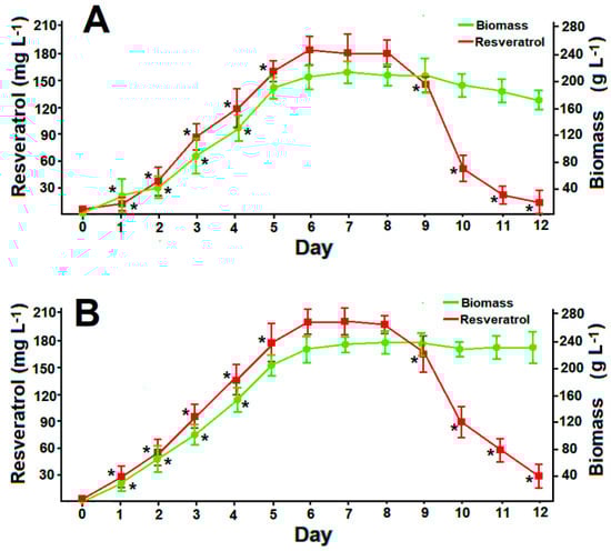 Kinetic analyses of batch cultures containing optimal concentrations of these amino acids (200 mg L−1) showed that the highest RV accumulation was maintained from day 6 to day 8 (Figure 5). Nevertheless, RV levels were dramatically decreased after day 10 without a significant loss of biomass.