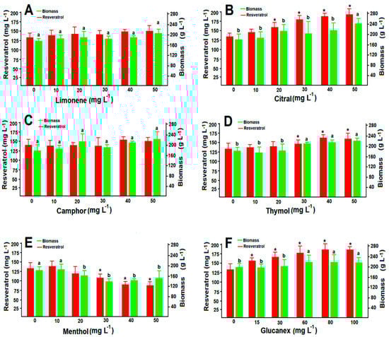 Production of RV and biomass by the addition of different concentrations (0–50 mg L−1) of limonene (A), citral (B), camphor (C), thymol (D), menthol (E) and Glucanex (F) (0–100 mg L−1) in batch cultures of A. aureus MaC7A analyzed at 7 days post-treatment. * Indicates statically significant differences (p < 0.05) for RV production compared with the control group (0 mg L−1). Means with different letters indicate statically significant differences among the biomass and volatile concentrations (p < 0.05). Error bars represent SD (n = 10).