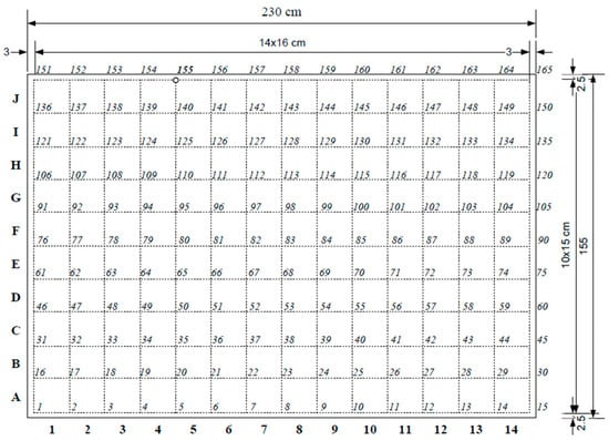 To further validate the MSDI method and investigate its robustness, we performed experimental research on a model of a reinforced concrete (RC) plate with plan dimensions 2.3 × 1.55 m and 7 cm of thickness. The plate was reinforced with the Q196 reinforcement mesh in the tension zone, and the thickness of the concrete cover was 2.5 cm. The mechanical properties of the concrete, i.e., the characteristic compressive strength (fck) and the modulus of elasticity (E), were determined on 28-day-old test specimens according to standards EN 12390-3 and EN 12390-13, respectively. The experimentally obtained values were fck = 70 MPa and E = 36 GPa. The model of an RC plate was divided into rectangular elements (16 cm × 15 cm); rows were marked in letters (A–J) and columns in numbers (1–14), as shown in Figure 1. A total of 165 (1–165) measurement points on the RC plate were used for the experimental modal analysis.