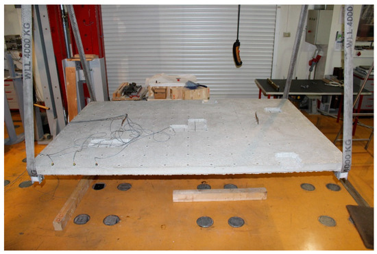 To achieve constant boundary conditions, we suspended the plate using very elastic ropes (Figure 2). The applied boundary conditions, a nearly ideal free-free set-up, were quickly implemented and easily repeated in the laboratory after each testing phase. The plate was tested in an undamaged state and then discrete damages were applied successively by removing parts of the surface from the top of the concrete plate.