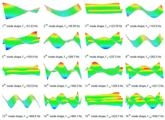 Figure 3. Sixteen mode shapes obtained experimentally on the undamaged plate.