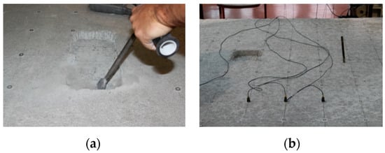 Figure 4. Discrete damages on the RC plate: (a) chiseling; (b) one of the damage locations on the concrete plate.