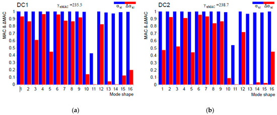 Furthermore, it is interesting to compare diagonal elements of the MAC and ΔMAC matrices both in numerical and experimental examples. In the numerical analysis, almost all coefficients participate with the maximum value 1 when damage is detected [30] because there are no measurement uncertainties. The comparison of experimentally obtained values is presented in Figure 7 for the first 16 mode shapes of the plate for damage cases DC1 and DC2. Some of the mode shapes for both damage cases were inconsistent (Figure 7a, mode shapes 11, 13, 14; Figure 7b, mode shapes 11, 13, 14, 15) in the undamaged and damaged states as a result of noise in the measurement signal and some other uncertainties (experimentally unrepeatable boundary conditions). It is shown that only a few mode shapes participated with values close to 1 (Figure 7a, mode shapes 1, 4, 6), whose weighting factor Δ α k l on modal displacements (Equations (5) and (6)) was sufficient for damage localization. Mentioned uncertainties are challenging to simulate or predict by numerical analysis. Thus, it is essential to emphasize the importance of validating damage detection methods on the basis of experimental results.