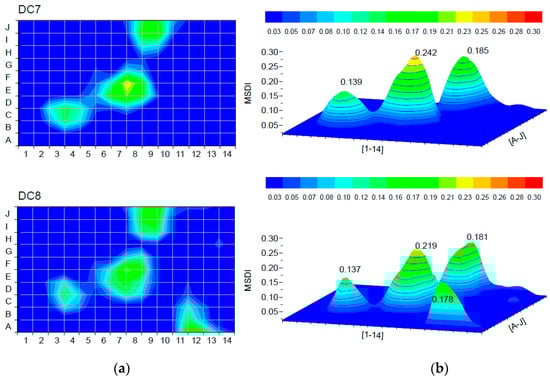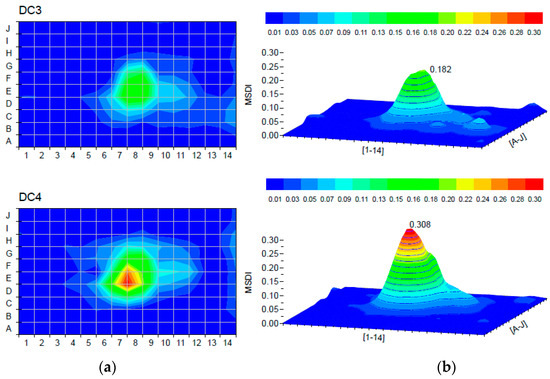 The first two damage cases at a single damage location were analyzed to determine the effect of the damage level when using the MSDI method. Damage cases DC1 and DC2 at element E8 simulated two levels of damage, “small” (depth of 2 cm) and “moderate” damage (depth of 3 cm). The damage location was determined by the MSDI method and presented as a colored graphical representation in Figure 6 for the first two damage cases. The MSDI values were calculated according to Equation (4). The peak values indicate the location of the damage on the plate in 3D view, and the damaged area is presented in 2D view. The exact location of the discrete damage, the element E8, was accurately identified. Moreover, the increase from small to moderate damage was followed by the increase of the MSDI value.