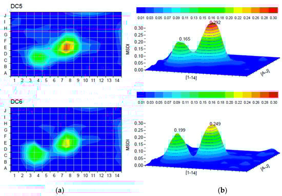 The remaining damage cases were analyzed to primarily investigate the effect of multiple damages on the MSDI method. In damage cases DC5 (DC4 + element C4) and DC6 (DC5 + element C3), the effect of multiple damages and the effect of the damage zone size were considered by adding another damage location on the plate. When we compared the results for both damage cases in Figure 9, we found that the MSDI method was able to register both damages, regardless of the damage zone size. The peak MSDI values at the two locations coincided with the reduction of stiffness. Moreover, the damage severity was smaller at the single damaged element C4 (see Figure 9, DC5) than the damaged zone C4-C3 (see Figure 9, DC6).