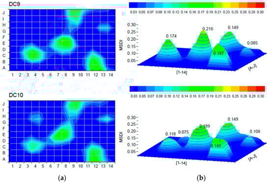 Figure 11. Damage localization for damage cases DC9 and DC10: (a) 2D; (b) peak values in 3D.