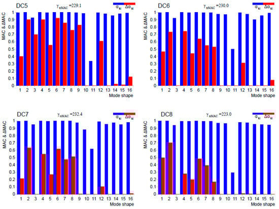 The diagonal elements of the MAC and ΔMAC matrices are shown for the damage cases DC5 to DC10 in Figure 12. It is noted that the number of mode shapes that were participating in damage detection decreased with the introduction of new damages. The first reason was that the intensity ( α k l value) decreased due to the low degree of consistency between estimated modal vectors in the undamaged and damaged states. The second reason was that some mode shapes entirely disappeared due to a significant change of consistency between estimated modal vectors. Even though a smaller number of mode shapes were used for damage detection based on the MSDI method, they were still able to provide useful information about the location of structural damage.