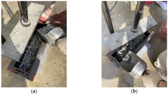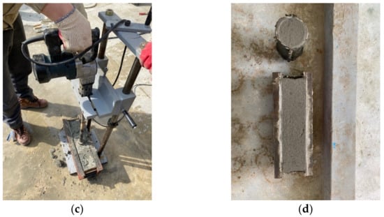 The specimen dimensions for testing mechanical properties and durability were as follows: cylindrical specimens measuring Ø100 × 200 mm were used for compressive strength, splitting tensile strength, and chloride ion penetration tests; prism-shaped specimens with dimensions of 100 × 100 × 400 mm were used for flexural strength and freeze-thawing testing, and cylindrical specimens measuring Ø150 × 150 mm were used in abrasion tests. Figure 2 shows the manufacturing process for HFLMC specimens. First, molds were filled with coarse aggregate (Figure 2a). Second, water, rapid-set cement, sand, latex, and fiber were mixed in a mixer for 1.5 min and then poured into a mold containing the coarse aggregate (Figure 2b). Finally, the surface of the specimen was compacted using a special vibratory press compactor (Figure 2c). Figure 2d shows manufactured compression and flexural strength specimens. Vibratory press compaction ensured that the latex-modified rapid-set cement material filled the voids in the coarse aggregate. No signs of insufficient compaction, such as persistent voids, were observed. In addition, no material separation of fibers from the latex-modified rapid-set cement was observed.