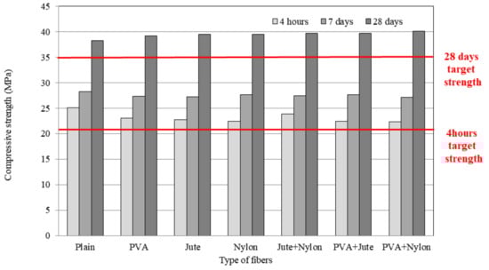 All of the mixtures created in this study satisfied the requirement of 21 MPa compressive strength after 4 h. After 7 days, the fiber-reinforced and plain mixtures had similar compressive strengths. After 28 days, all mixtures met the target compressive strength of 35 MPa. After 28 days, the fiber-reinforced materials showed greater splitting tensile strengths than the plain mixtures, with enhancements of 2.62%, 3.31%, 3.39%, 3.83%, 3.91%, and 5.01%, respectively, for mixtures containing PVA, jute, nylon, jute+nylon, PVA+jute, and PVA+nylon fibers. The compressive strengths of fiber-reinforced mixtures were 2.62–5.01% higher than those of plain mixtures. Furthermore, hybrid fiber mixtures were more effective than single fiber mixtures in terms of strength enhancement. This can be attributed to the greater diversity in fiber length and diameter of the hybrid mixtures, which was more effective for filling voids within the concrete, thereby suppressing crack formation and growth [,]. Notably, the PVA+nylon hybrid fiber mixture developed the highest compressive strength. The variety in fiber dimensions suppressed both macro and micro-crack formation. However, batch-to-batch variation in concrete quality is a concern. From a quality control perspective, synthetic nylon and PVA fibers are preferred because their properties can be readily controlled by the manufacturer. In contrast, the properties of jute fibers, as a natural material, are difficult to control.