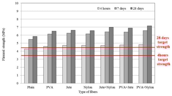 The flexural strengths of the HFLMC mixtures for emergency pavement repair are shown in Figure 4. All of the mixtures attained the minimal traffic-opening criteria of flexural strength of 3.5 and 4.5 MPa at 4 h and 28 days, respectively. The hybrid fiber-reinforced mixtures had higher flexural strengths than those of the single-fiber reinforced mixtures. Fiber reinforcement had a greater influence on flexural strength than on compressive strength. Notably, the PVA–nylon hybrid fiber-reinforced mixture had the highest flexural strength among the studied HFLMC mixtures. After 28 days of curing, the flexural strengths of mixtures containing PVA, jute, nylon, jute+nylon, PVA+jute, and PVA+nylon fibers increased over those of the plain mixtures by 11.03%, 13.21%, 12.31%, 19.23%, 17.89%, and 22.30%, respectively. These data show that the hybrid systems are more effective for reinforcing concrete materials. As discussed above, the hybrid fibers were better able to suppress crack formation due to the variability in fiber length and diameter [].