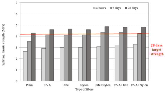 In general, adding fibers to concrete is more effective for increasing tensile strength than compressive strength []. This is because fiber reinforcement suppresses crack formation and growth, the main factors responsible for concrete fracture []. In addition, crack suppression is more effective with hybrid fiber mixtures than with single-type fibers [,,,]. In the current study, the hybrid fiber system satisfied the 4.2 MPa requirement after only 7 days. After 28 days, the splitting tensile strengths of mixtures containing PVA, jute, nylon, jute+nylon, PVA+jute, and PVA+nylon fibers increased over those of plain mixtures by 7.27%, 8.65%, 7.19%, 12.24%, 12.12%, and 13.31%, respectively. The PVA+nylon hybrid fiber system yielded the highest splitting tensile strength.