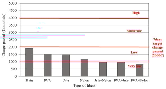 Figure 6 shows the amount of charge passed during chloride ion permeation tests on the HFLMC mixtures. The solid line corresponds to the permeability criteria specified by the ASTM C1202. Fiber-reinforced mixtures had less charge passed compared to plain mixtures, and those containing hybrid fibers were less permeable than those containing single-type fibers. The single-type fiber system passed about 1500–2000 coulombs, corresponding to “low” permeability according to ASTM C1202. In contrast, the hybrid fiber system passed only 1000 coulombs or less, corresponding to “very low” permeability. After 28 days, the permeabilities of mixtures containing PVA, jute, nylon, jute–nylon, PVA+jute, and PVA+nylon fibers decreased compared to those of plain mixtures by 20.4%, 22.9%, 37.5%, 50.2%, 49.8%, and 56.0%, respectively.