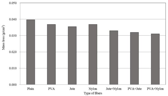 Figure 7 shows the abrasion resistance of the HFLMC mixtures for emergency pavement repair. Compared to mixtures without fibers, those containing PVA, jute, nylon, jute–nylon, PVA+jute, and PVA+nylon fibers showed 7.31%, 10.64%, 7.30%, 16.95%, 19.51%, and 22.60% increases in abrasion resistance, respectively. This is because the fibers prevent particles from breaking free of the concrete surface. Furthermore, the fibers suppressed the occurrence and growth of surface microcracks and created denser concrete structures [,]. The abrasion resistance of HFLMC was much greater than that of the plain mixtures. As with the other mechanical properties, the hybrid fiber system was more effective than the single-type fiber-reinforced system at suppressing the formation and growth of cracks within and on the surface of the concrete. Notably, the PVA+nylon hybrid fiber-reinforced mixture exhibited the greatest resistance to abrasion.