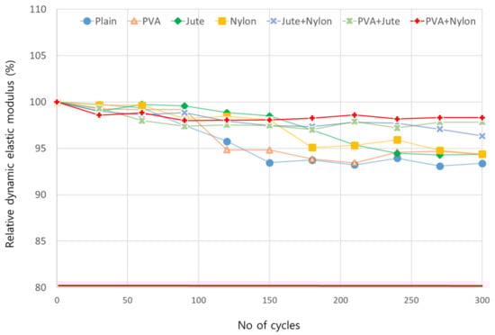 The relative dynamic moduli of the HFLMC mixtures are shown in Figure 8. All mixtures satisfied the target relative dynamic modulus of 80% after 300 cycles of freezing and thawing. However, plain mixtures showed a marked decrease in relative dynamic modulus after 90 cycles with further decreases up to 300 cycles. In contrast, the fiber-reinforced mixtures had relative dynamic moduli exceeding 95% or higher, indicating greater freeze–thaw resistance than the plain mixtures. Note that the single-type fiber systems also exhibited decreases in relative dynamic modulus, although the cycle at which the decreases began varied with the type of fiber: 120 cycles for PVA fiber, 180 cycles for nylon fiber, and 210 cycles for jute fiber. After 300 cycles, the relative dynamic moduli of mixtures containing PVA+nylon, PVA+jute, jute+nylon fiber, PVA, jute, and nylon fibers were 98.30%, 97.82%, 96.32%, 94.36%%, 94.34%, and 94.26%, respectively, By comparison, the relative dynamic modulus of the plain mixture was 93.37%. The relative dynamic moduli of hybrid fiber-reinforced mixtures remained nearly constant. In particular, the PVA+nylon hybrid fiber-reinforced mixture exhibited the highest freeze–thaw resistance. This was attributed to the presence of latex in the mixture []. It is also likely that the fibers suppressed the formation and growth of microcracks induced by repeated freezing and thawing. Note also that the hybrid fiber mixtures were more resistive to freeze–thaw cycles than the plain mixtures.
