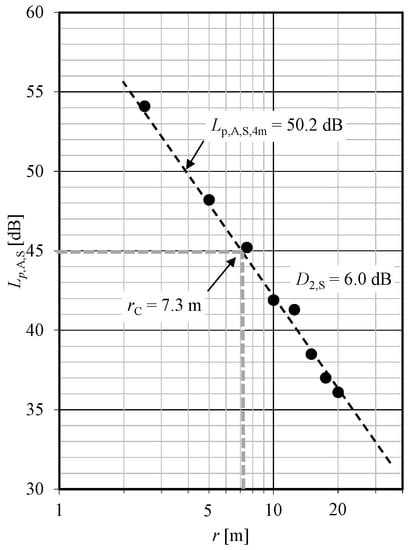 Figure 1. A-weighted SPL, Lp,A, as a function of distance, r, to the speaker (black circles) and a linear fit over the data (dashed line). Definitions for D2,S, LpA,S,4m, and rC are given in Section 1. The data is not related to this study. - the A-weighted SPL of speech at 4 m distance from the speaker, Lp,A,S,4m [dB] (Figure 1),
