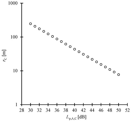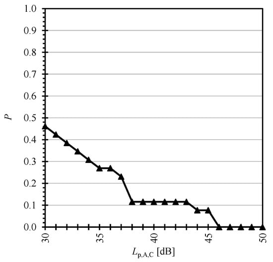 Figure 5 clearly shows that the probability P reaches zero when Lp,A,C > 45 dB. Therefore, this value was chosen as the comfort distance criterion. Further justification for this choice is given in Section 4.
