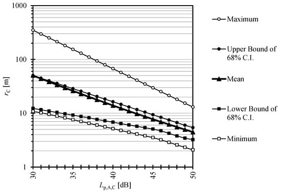 The range of comfort distance values, rC, as a function of the comfort criterion level, Lp,A,C, for the 26 offices of Ref. [17] calculated by Equation (2). Mean, maximum, minimum, and 68% confidence interval (C.I.) within the sample of 26 offices are shown.
