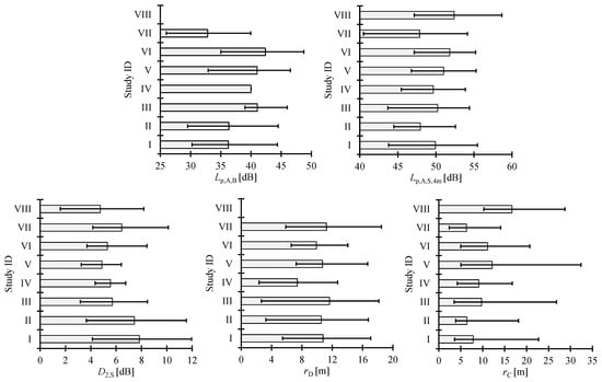 Distribution of measurement results according to ISO 3382-3 standard in the eight studies of Table 2. Bars are the means and whiskers are the 95% confidence intervals.