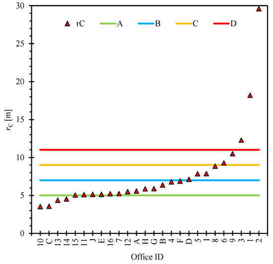 Figure 7 presents an analysis of how the acoustic classes A–D of comfort distance could be set in a balanced way for the 26 offices of Table 1. We paid attention to three criteria: each class involves at least two offices, the classes are equally spaced, and some offices (two worst ones) can remain unclassified. The limit values for classes A to D became 5, 7, 9, and 11 m for rC. The ranges for classes A–D are [0–5) m, [5–7) m, [7–9) m, and [9–11) m, respectively. Values of 11 m and higher are unclassified.