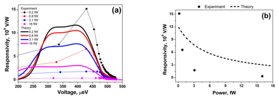 The responsivity, SV, is measured in this manner. A modulated signal, generated by internal oscillator of a lock-in amplifier, was biased with a resistor to produce the heating current, which was applied across the outer SIN tunnel junctions. This generates a voltage response across the inner tunnel junctions, measured with the SR830 lock-in amplifier. The dependence of the response across the inner junctions to the bias current was then measured, and then divided by the heating power. The heating power was estimated from the IV characteristics of the outer tunnel junctions. The bias current was converted to bias voltage using the IV characteristics of the response junctions. Figure 2 shows the dependence of the responsivity on the bias voltage for different heating powers of 0.2, 0.8, 3.1 and 16 fW at 35 Hz modulation. For comparison, the theoretical responsivity is also presented in Figure 2. The dependence of the maximum response on varying heating powers plotted against the theoretical responsivity, is shown in Figure 2b. The responsivity has a maximum value of 1.5 × 1010 V/W and decreases with increasing power at a modulation frequency of 35 Hz. The theoretical responsivity, shown as the dashed line in Figure 2b, has a similar trend to the experimental result.