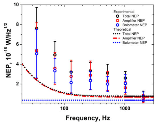 In this work, we present our measurements of the total NEP, the bolometer NEP and the amplifier NEP. The amplifier NEP is determined by dividing the measured voltage noise of the amplifier and the responsivity. The total NEP is obtained by measuring the voltage noise at the output of the preamplifier, which was then divided by the measured responsivity of the device. The bolometer NEP was then estimated from Equation (2), by subtracting the amplifier NEP from the total NEP. The total NEP, bolometer NEP and NEP of the amplifier from 35 Hz to 2 kHz is shown in Figure 3. The theoretical predictions for the total NEP, bolometer NEP, and NEP due to the amplifier are shown as dashed lines. At low frequencies, we include the 1/f noise due to the amplifier in our theoretical fit which agrees quite well with the experimental results at lower frequencies. As seen in Figure 3, the total NEP for all modulation frequencies is in the order of 10−18 W/Hz1/2. The maximum measured bolometer NEP is 5 × 10−18 W/Hz1/2 at 35 Hz, while the minimum measured bolometer NEP is 10−18 W/Hz1/ at 2 kHz. Photon noise at the level of 10−18 W/Hz1/2 is for a signal of 10 fW at a frequency of 80 GHz. That means that for the power and frequency of the signal higher than these values, photon noise will dominate over the noise of CEB.