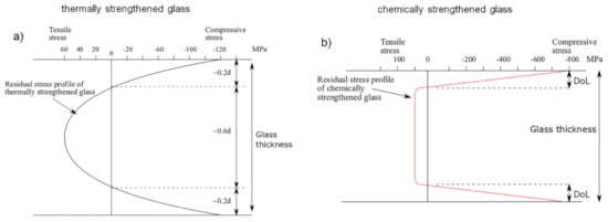 Residual stress profile through the glass thickness for: (a) thermally tempered glass; (b) chemically toughened glass. d is the glass thickness; DoL is the depth of layer. Figure reprinted from [67] under the terms of the Creative Commons Attribution 4.0 International License.