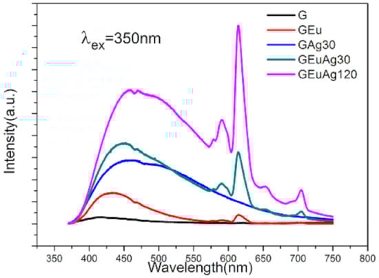 Similarly, Li et al. studied the effects of silver doping by ion-exchange on the photoluminescence emission in Eu3+ sodium-aluminosilicate glass [60]. As shown in Figure 3, the inclusion of silver aggregates produced a broad emission band in the 400-700 nm interval overlapping the Eu2+ 5d-4f emission, and a substantial increase of the 615 nm line of Eu3+ when excited at 350 nm as the silver content was increased.