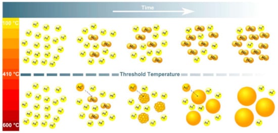 The most common and simple strategy is represented by a thermal annealing treatment, carried out in air (O2) in a suitable furnace, at a temperature close to the transition temperature Tg of the glass. The mechanism that regulates the formation of silver NPs inside an ion-exchanged soda-lime glass by means of this thermal post-process is well explained in the work of A. Simo et al. and outlined in Figure 4 below [106].