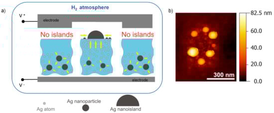 (a) A sketch of the mechanism of silver nanoislands growth by poling treatment following by a thermal annealing treatment in H2 controlled atmosphere; (b) an AFM image of a nanoisland group in a not poled region after annealing treatment in H2. Figure adapted from paper [164] under the terms of the Creative Commons Attribution 4.0 International License.