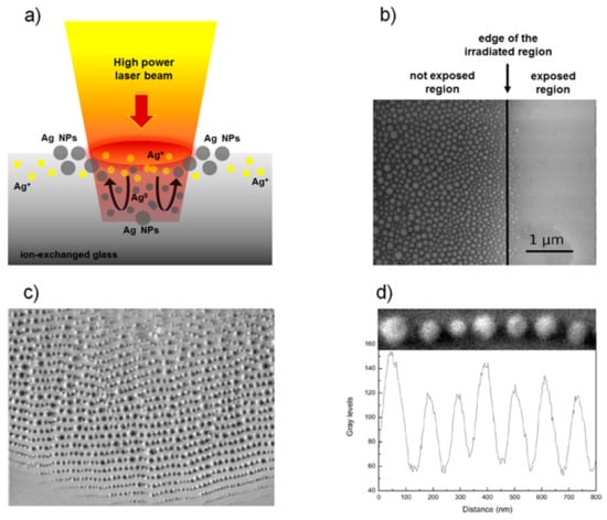 (a) Growth process of metal silver nanoparticles on the ion-exchanged sample surface at the edge of an exposed zone by high power laser irradiation; (b) a comparison between the distribution of silver nanoparticles in the exposed and not-exposed region, respectively (adapted with permission from [165] © The Optical Society); (c) a SEM image of a quasi-periodic arrangement between silver NPs; (d) an ordered silver nanoparticle array, with its surface profile plot, obtained by laser beam irradiation technique (reprinted with permission from [166] © The Optical Society).