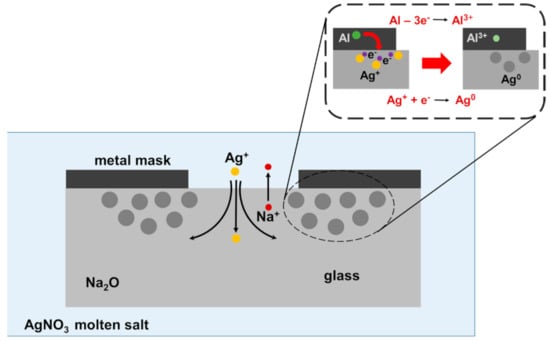 In the masked ion-exchange process in silver molten salts, the reduction mechanism of silver ions in metallic form is strictly related to the presence of electrical potential differences among the molten salt, the glass and the metal mask. This produces an ionic current flow: the silver ions migrate from the molten salt into the glass through the mask openings, concentrating in the region under the mask edges. Here, by capturing an electron made available by the metal mask, the silver ions are progressively reduced to metallic state [103,104]. Figure 7 shows the effect of a metal mask on the reduction of silver ions following the ion-exchange process.