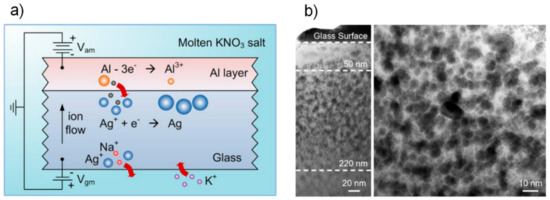 In the second approach, the deposed metal thin film works as an electrode in a double ion-exchange process. The glass sample is loaded with silver ions through a simple ion-exchange in molten salt. Subsequently, a thin metal film of aluminium is deposited on one of the two sample faces. The sample is then immersed in a potassium molten salt bath. In this way, the overall system represented by the metal thin film, the ion-exchanged glass and the molten salt acts as a real galvanic cell. In fact, two electric potentials are soon established on the two faces of the glass. The first, positive type, is located near the glass-salt interface and takes place from the different inter-diffusivity of the ionic species involved in the process. In this region, the Ag+ and Na+ ions diffuse faster in the molten salt than the K+ ions in the glass. The second, negative type, is generated near the other thin film-molten-salt interface. Here the thin aluminium film tends to release electrons to the Ag+ ions in the glass while Al3+ ions migrate to the molten potassium salt. This electrical potential difference produces an ionic current inside the glass which forces the silver ions to move to the surface of the specimen, in an area immediately below the metal electrode. In this region, the silver ions are reduced in metallic form through the acquisition of an electron coming from the metallic film. The formation of silver nanoparticles is also promoted by the continuous flow of silver ions coming from the deeper regions of the glass towards the interface with the aluminium thin film [159]. Figure 8 describes the mechanism mentioned above (Figure 8a), reporting a scanning electron microscope (SEM) cross-section image of the silver nanoparticles distribution under the sample surface (Figure 8b).
