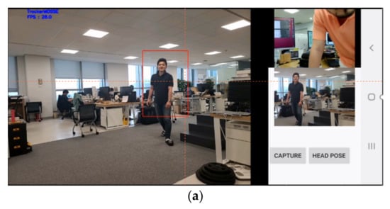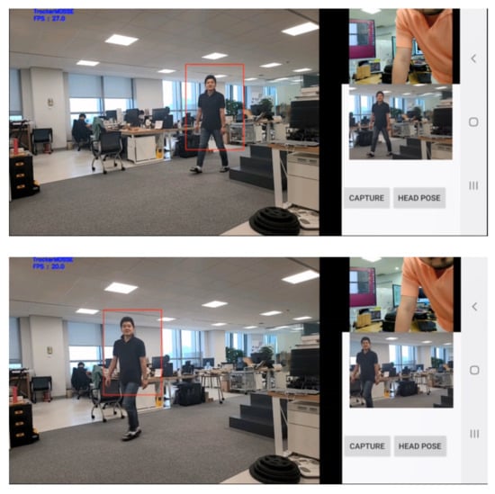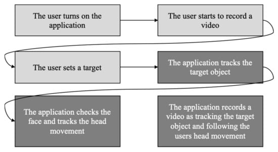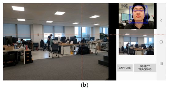 We developed an application that employs object tracking and user face recognition technologies (Figure 5 and Figure 6). The application has two different modes. First, the user checks the target object, and the camera then automatically tracks that object. This mode helps the user feel confident of not missing the target object while recording the video. Second, the user can choose the mode that identifies the direction of the head through face detection. Hence, the angle of the camera moves automatically according to the direction of the user’s head. This helps the user become more immersed in the real world because the camera detects the direction of the head and records the user’s view.